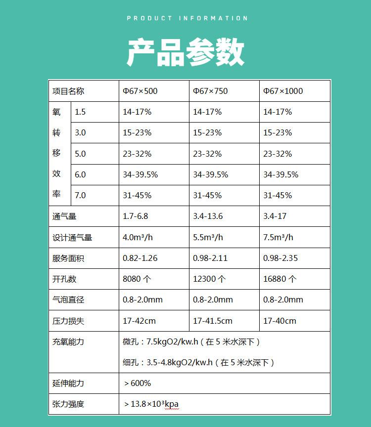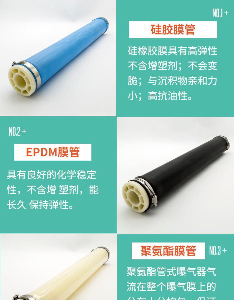 1.曝氣膜管采用三元乙丙橡膠(EPDM)材料,具有耐熱、耐臭氧、耐酸堿、化學穩(wěn)定性好等特點,與一般橡膠膜相比,可大大提高其使用壽命。