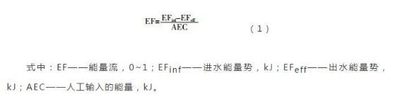 能量流分析是將進(jìn)出污水處理系統(tǒng)的各種污染物按照能量的方式統(tǒng)一計(jì)量,將污水處理廠的運(yùn)行效果從物質(zhì)角度的多指標(biāo)評(píng)價(jià)轉(zhuǎn)化成從能量角度的單一指標(biāo)評(píng)價(jià)。能量流的定義如式(1)所示。
